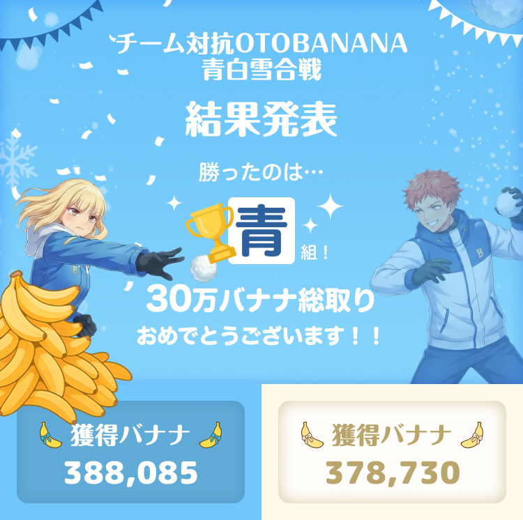 2月18日〜2月24日に開催された 「チーム対抗🔥OTOBANANA青白雪合戦❄」 の結果を発表いたします!
